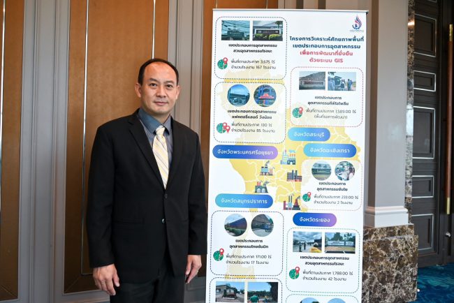นายวีรพงษ์ เอี่ยมเจริญชัย รองอธิบดีกรมโรงงานอุตสาหกรรม กระทรวงอุตสาหกรรม กล่าวว่า กรมโรงงานอุตสาหกรรม โดยกองส่งเสริมเทคโนโลยีการผลิตและพื้นที่อุตสาหกรรม ได้ร่วมกับ บริษัท ฟิกท์ แอสโซซิเอท จำกัด ในการศึกษา “โครงการวิเคราะห์ศักยภาพพื้นที่เขตประกอบการอุตสาหกรรมเพื่อการพัฒนาที่ยั่งยืน ด้วยระบบ GIS (ภายใต้ค่าใช้จ่ายในการพัฒนาพื้นที่อุตสาหกรรมเพื่อรองรับการลงทุน)” ในเขตประกอบการอุตสาหกรรมที่มีศักยภาพในการพัฒนา จำนวน 8 เขตประกอบการ ใน 5 จังหวัด ประกอบด้วย