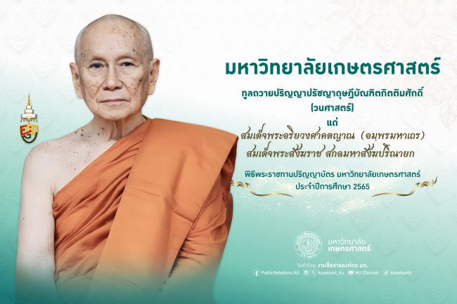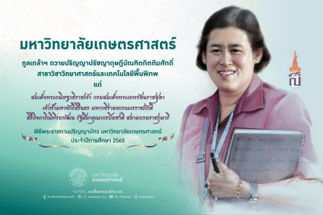 มหาวิทยาลัยเกษตรศาสตร์ ได้รับพระมหากรุณาธิคุณจากพระบาทสมเด็จพระเจ้าอยู่หัว ทรงพระกรุณาโปรดเกล้าฯ ให้ สมเด็จพระเจ้าน้องนางเธอ เจ้าฟ้าจุฬาภรณ์วลัยลักษณ์ อัครราชกุมารี กรมพระศรีสวางควัฒน วรขัตติยราชนารี เสด็จแทนพระองค์ไปพระราชทานปริญญาบัตร แก่ผู้สำเร็จการศึกษาจากมหาวิทยาลัยเกษตรศาสตร์ ประจำปีการศึกษา 2565 ระหว่างวันที่ 9 – 12 ตุลาคม 2565 เวลา 14.00 น. ณ อาคารจักรพันธ์เพ็ญศิริ มหาวิทยาลัยเกษตรศาสตร์ บางเขน โดยมีผู้สำเร็จการศึกษา ประจำปีการศึกษา 2565 จำนวน 16,233 คน แบ่งเป็น ดุษฎีบัณฑิต 244 คน มหาบัณฑิต 1,802 คน บัณฑิต 14,187 คน บัณฑิตได้รับเกียรตินิยมอันดับหนึ่ง จำนวน 2,069 คน เกียรตินิยมอันดับสอง จำนวน 2,375 คน