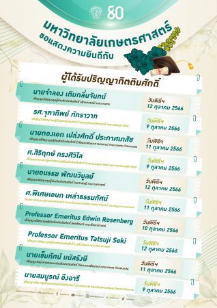 ในปีนี้ สภามหาวิทยาลัยเกษตรศาสตร์ ได้มีมติเป็นเอกฉันท์ให้ทูลถวายปริญญาปรัชญาดุษฎีบัณฑิตกิตติมศักดิ์ สาขาวิชาวนศาสตร์ แด่ สมเด็จพระอริยวงศาคตญาณ (อมฺพรมหาเถร) สมเด็จพระสังฆราช สกลมหาสังฆปริณายก มีมติเป็นเอกฉันท์ให้ขอพระราชทานทูลเกล้าฯ ถวายปริญญาปรัชญาดุษฎีบัณฑิตกิตติมศักดิ์ สาขาวิชาวิทยาศาสตร์และเทคโนโลยีพื้นพิภพ แด่ สมเด็จพระกนิษฐาธิราชเจ้า กรมสมเด็จพระเทพรัตนราชสุดาฯ เจ้าฟ้ามหาจักรีสิรินธร มหาวชิราลงกรณวรราชภักดี สิริกิจการิณีพีรยพัฒน รัฐสีมาคุณากรปิยชาติ สยามบรมราชกุมารี และอนุมัติให้ปริญญากิตติมศักดิ์ แก่ผู้ทรงคุณวุฒิ จำนวน 10 คน