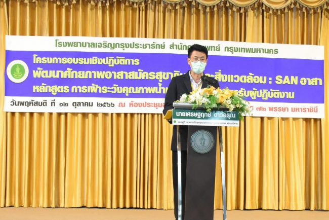 วันที่ 12 ตุลาคม 2566 เวลา 13.00 น. นายเศรษฐฤกษ์ ดาวอรุณ รองผู้อำนวยการโรงพยาบาลเจริญกรุงประชารักษ์ (ฝ่ายบริหาร) เป็นประธานเปิด โครงการอบรมเชิงปฏิบัติการพัฒนาศักยภาพอาสาสมัครสุขาภิบาลและสิ่งแวดล้อม หลักสูตรการเฝ้าระวังคุณภาพน้ำเพื่อการอุปโภคบริโภคสำหรับผู้ปฏิบัติงาน ณ ห้องประชุมอุดมสังวรญาณ ชั้น 23 อาคาร 72 พรรษา มหาราชินี ในการอบรมครั้งนี้ ได้ให้ความสำคัญในด้านการจัดการสุขาภิบาลน้ำ เพื่อการอุปโภคให้มีความสะอาดและปลอดภัยอย่างต่อเนื่อง และการเฝ้าระวังคุณภาพน้ำเพื่อการอุปโภคบริโภคสำหรับผู้ปฏิบัติงาน พร้อมพัฒนาศักยภาพแกนนำ SAN อาสาในการเฝ้าระวังสภาพสุขาภิบาลน้ำเพื่อการอุปโภคบริโภคของโรงพยาบาลให้ได้มาตรฐานและมีความยั่งยืน