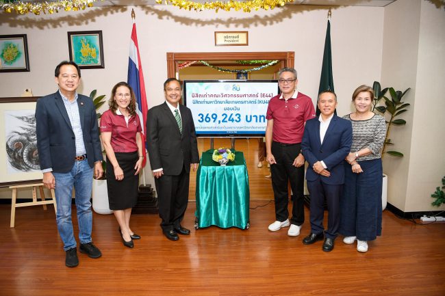 ดร.จงรัก วัชรินทร์รัตน์ อธิการบดีมหาวิทยาลัยเกษตรศาสตร์ รับมอบเงินบริจาคเพื่อสนับสนุน คณะแพทยศาสตร์และโรงพยาบาลมหาวิทยาลัยเกษตรศาสตร์ จากนิสิตเก่ามหาวิทยาลัยเกษตรศาสตร์ ดังนี้ 1.)นิสิตเก่ามหาวิทยาลัยเกษตรศาสตร์ รุ่นที่ 23 (KU23) จำนวน 1,224,000 บาท 2.)นิสิตเก่าคณะวิศวกรรมศาสตร์ (E24) นิสิตเก่ามหาวิทยาลัยเกษตรศาสตร์ รุ่นที่ 28 (KU28) โดย นายอำนวย เนตยสุภา และครอบครัว จำนวน 1,000,000 บาท และ 3.)นิสิตเก่าคณะวิศวกรรมศาสตร์ (E44) นิสิตเก่ามหาวิทยาลัย เกษตรศาสตร์ รุ่นที่ 48 (KU48) จำนวน 369,243 บาท โดยมี ดร.ดำรงค์ ศรีพระราม รองอธิการบดีฝ่ายบริหาร ผศ.ดร.นุชนาถ มั่งคั่ง รองอธิการบดีฝ่ายการเงินและทรัพย์สิน ผศ.ดร.ธานินทร์ คงศิลา รองอธิการบดีฝ่ายกิจการสภามหาวิทยาลัยและพัฒนาทรัพยากรมนุษย์ และ ผศ.ดร.จิตต์โสภิณ มีระเกตุ ผู้ช่วยอธิการบดี ร่วมเป็นสักขีพยาน ณ อาคารสารนิเทศ 50 ปี มหาวิทยาลัยเกษตรศาสตร์