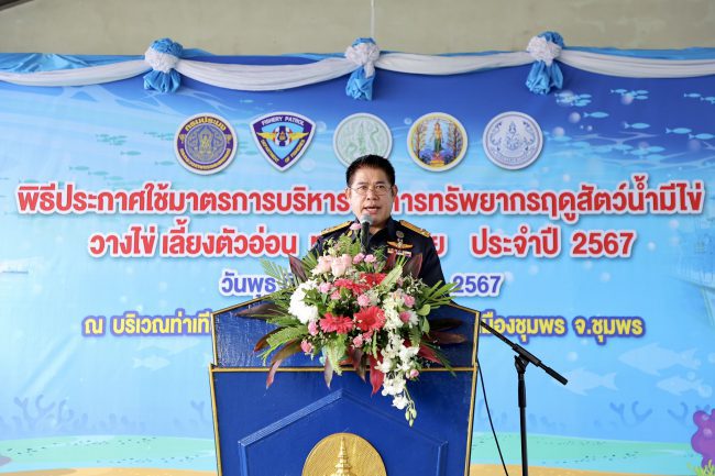 ร้อยเอก ธรรมนัส พรหมเผ่า รัฐมนตรีว่าการกระทรวงเกษตรและสหกรณ์ เป็นประธานใน “พิธีประกาศใช้มาตรการบริหารจัดการทรัพยากรสัตว์น้ำมีไข่ วางไข่ เลี้ยงตัวอ่อน พื้นที่ทะเลอ่าวไทย ประจำปี 2567” ณ ท่าเทียบเรือประมงชุมพร ตำบลปากน้ำ อำเภอเมือง จังหวัดชุมพร ซึ่งมาตรการดังกล่าว ยังคงเป็นมาตรการที่กระทรวงเกษตรฯ โดยกรมประมงดำเนินการมาอย่างต่อเนื่องเป็นประจำทุกปี ครอบคลุมพื้นที่บริเวณอ่าวไทย โดยแบ่งเป็นบริเวณพื้นที่อ่าวไทยตอนกลาง 2 ช่วงระยะเวลา ได้แก่ ระหว่างวันที่ 15 กุมภาพันธ์ – 15 พฤษภาคม 2567 ตั้งแต่ปลายแหลมเขาม่องไล่ จังหวัดประจวบคีรีขันธ์ ถึงอำเภอดอนสัก จังหวัดสุราษฎร์ธานี และระหว่างวันที่ 16 พฤษภาคม – 14 มิถุนายน 2567 ในบริเวณอาณาเขตตามแผนที่แนบท้ายของประกาศปิดอ่าวไทยตอนกลางและเขตต่อเนื่องตั้งแต่ปลายแหลมเขาม่องไล่ ถึงอำเภอหัวหิน จังหวัดประจวบคีรีขันธ์ ตามแผนที่แนบท้ายของประกาศปิดอ่าวประจวบ และบริเวณพื้นที่อ่าวไทยรูปตัว ก 2 ช่วงระยะเวลา ได้แก่ ระหว่างวันที่ 15 มิถุนายน – 15 สิงหาคม 2567 ในพื้นที่อ่าวไทยตอนในฝั่งตะวันตกของจังหวัดประจวบคีรีขันธ์ เพชรบุรี สมุทรสงคราม และสมุทรสาคร และระหว่างวันที่ 1 สิงหาคม – 30 กันยายน 2567 ในพื้นที่อ่าวไทยตอนในด้านเหนือของจังหวัดสมุทรสาคร กรุงเทพมหานคร สมุทรปราการ ฉะเชิงเทรา และชลบุรี โดยมีวัตถุประสงค์เพื่อฟื้นฟูและบริหารจัดการทรัพยากรสัตว์น้ำฝั่งทะเลอ่าวไทยซึ่งเป็นแหล่งวางไข่และอาศัยเลี้ยงตัวอ่อนของสัตว์น้ำหลายชนิด ด้วยการคุ้มครองพ่อแม่พันธุ์สัตว์น้ำที่มีความสมบูรณ์เพศพร้อมผสมพันธุ์วางไข่ และปกป้องสัตว์น้ำวัยอ่อนให้มีโอกาสเจริญเติบโตเป็นสัตว์น้ำรุ่นต่อไป