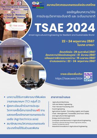 สมาคมวิศวกรรมเกษตรแห่งประเทศไทย ขอเชิญส่งบทความผลงานวิจัยเข้าร่วมการประชุมวิชาการสมาคมวิศวกรรมเกษตรแห่งประเทศไทย ระดับนานาชาติ ครั้งที่ 17 และระดับชาติครั้งที่ 25 (THE 17th TSAE INTERNATIONAL CONFERENCE & 25th TSAE NATIONAL CONFERENCE, TSAE 2024) วันที่ 22-24 พฤษภาคม 2567 ณ ศูนย์นิทรรศการและการประชุมนานาชาติกรุงเทพฯ (ไบเทค บางนา)