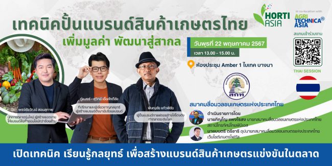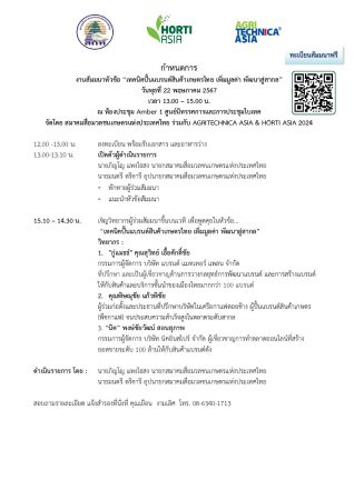 สมาคมสื่อมวลชนเกษตรแห่งประเทศไทย ร่วมกับ บริษัท วีเอ็นยู เอเชีย แปซิฟิค จำกัด จัดสัมนาหัวข้อ “เทคนิคปั้นแบรนด์สินค้าเกษตรไทย เพิ่มมูลค่า พัฒนาสู่สากล” งานประชุมสุดยอดอุตสาหกรรมเกษตรระดับภูมิภาคเอเซีย หรือ AGRITECHNICA ASIA (อะกริเทคนิก้า เอเชีย) และงาน HORTI ASIA (ฮอร์ติ เอเชีย) ในวันที่ 22 พฤษภาคม 2567 ณ ห้องประชุม Amber 1 ศูนย์นิทรรศการและการประชุม ไบเทค กรุงเทพฯ ตั้งแต่เวลา 13:00-15:00 น.