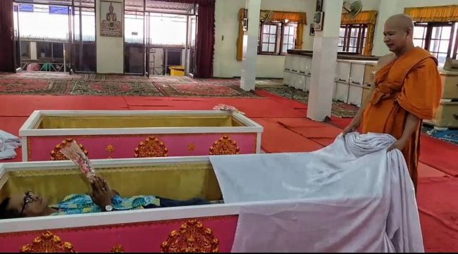 วัดหลวงพ่อปากแดง จัดพิธีนอนโลงศพสะเดาะเคราะห์ต่อชะตา ฝึกตายก่อนตายจริง