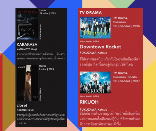 ซีรีส์โทรทัศน์ยอดนิยมสองเรื่อง ได้แก่ Downtown Rocket และ RIKUOH ก็พร้อมให้รับชมอย่างครบทุกตอนเช่นกัน ซีรีส์เหล่านี้สะท้อนถึงชีวิตผู้คนที่ขยันและทำงานหนักเพื่อไล่ตามความฝันอันยิ่งใหญ่ได้อย่างลึกซึ้งและกลายเป็นซีรีส์ฮิตทันทีเมื่อออกฉายในญี่ปุ่น