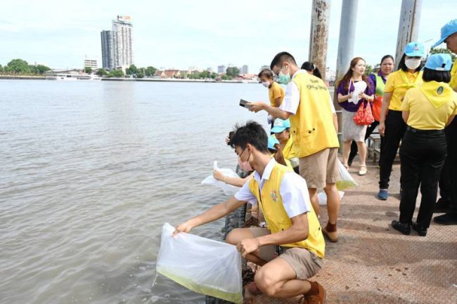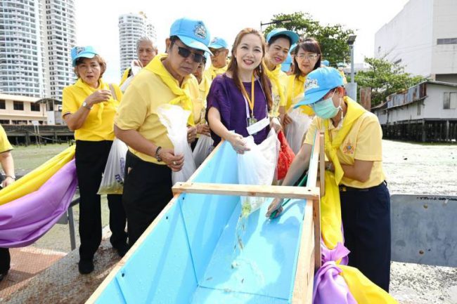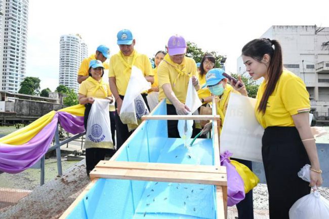 จากนั้นร่วมกับ ผู้แทนกรมประมง ผู้อำนวยการเขตยานนาวา ผู้อำนวยการเขตบางคอแหลม คณะผู้บริหาร บุคลากรโรงพยาบาลฯ จิตอาสา Yellow Birds ประธานเครือข่ายชุมชนเขตบางคอแหลม และประธานชุมชนวัดอินทร์บรรจง ร่วมปล่อยพันธุ์สัตว์น้ำ ณ ท่าน้ำถนนตก แม่น้ำเจ้าพระยา