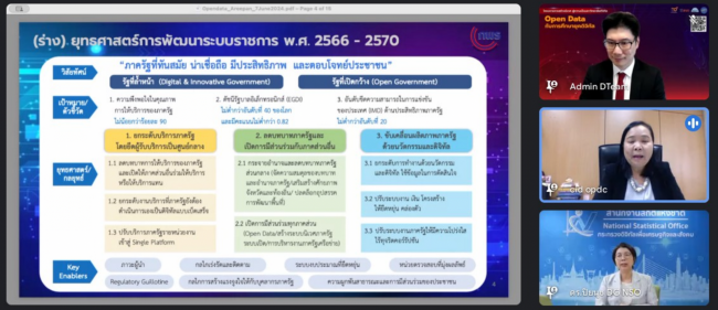 นางอารีย์พันธ์ เจริญสุข รองเลขาธิการสำนักงานคณะกรรมการพัฒนาระบบราชการ (ก.พ.ร.) กล่าวถึงเป้าหมายและทิศทางการทำ Open Data ระดับชาติ และการเชื่อมต่อกับข้อมูลมหาวิทยาลัยและภาคส่วนที่เกี่ยวข้อง ว่าข้อมูลที่ดีเป็นปัจจัยสำคัญของรัฐบาลดิจิทัลที่นำไปสู่การเป็นอัจฉริยะหรือความชาญฉลาดของประเทศ โดยการเกิดโควิด-19 ถือเป็นจุดเปลี่ยนในการพลิกวิกฤตให้เป็นโอกาสของระบบราชการไทยในการเชื่อมโยงและแบ่งปันข้อมูล โดยเฉพาะงานบริการผ่านระบบออนไลน์ที่ได้รับความสนใจจากผู้ใช้บริการเพิ่มขึ้นอย่างมาก แต่ในอีกความท้าทายที่ระบบราชการกำลังเผชิญ คือ การโจมตีหรือความปลอดภัยทางไซเบอร์ รวมถึงการส่งข้อมูลที่ถูกต้องของปัญญาประดิษฐ์