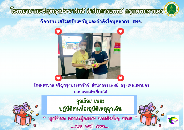 ในนามคณะผู้บริหาร โรงพยาบาลเจริญกรุงประชารักษ์ สำนักการแพทย์ กรุงเทพมหานคร ได้มอบกระเช้าให้แก่ บุคลากรที่นอนพักรักษาในโรงพยาบาล เพื่อเป็นขวัญและกำลังใจให้บุคลากร โดยกลุ่มประชาสัมพันธ์ ฝ่ายบริหารงานทั่วไป เป็นตัวแทนมอบกระเช้า