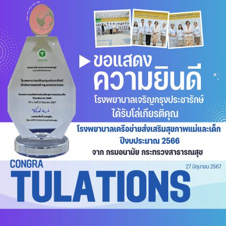 วันที่ 4 กรกฎาคม 2567 ขอแสดงความดี กับโรงพยาบาลเจริญกรุงประชารักษ์ ได้รับโล่เกียรติคุณ โรงพยาบาลเครือข่ายส่งเสริมสุขภาพแม่และเด็ก ปีงบประมาณ 2566 จากกรมอนามัย กระทรวงสาธารณสุข เมื่อวันที่ 27 มิถุนายน 2567 โดยมีนพ.พรเทพ แซ่เฮ้ง ผู้อำนวยการโรงพยาบาลเจริญกรุงประชารักษ์ คณะผู้บริหาร และบุคลากรทางการแพทย์ ร่วมแสดงความยินดี