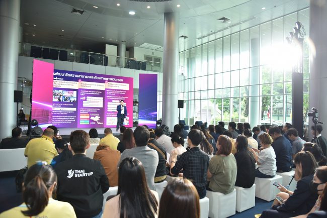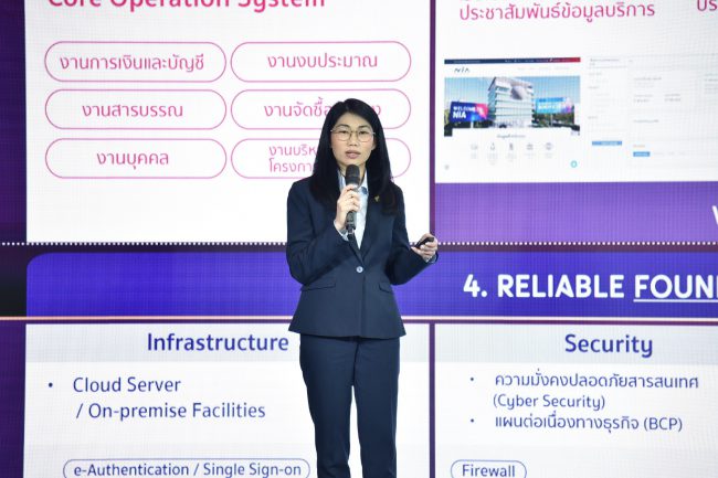 นางสาวสุพิชญา หลิมตระกูล รองผู้อำนวยการด้านยุทธศาสตร์องค์กร กล่าวว่า ในยุคปัจจุบันการเปลี่ยนแปลงทางดิจิทัล หรือ Digital Transformation เป็นการเพิ่มโอกาสและศักยภาพการบริการผู้ประกอบการนวัตกรรมผ่านดิจิทัลอย่างเต็มรูปแบบ ซึ่ง NIA มุ่งเน้นให้ความสำคัญกับการสร้างประสบการณ์การรับบริการและการทำงานของบุคลากรที่ตอบโจทย์เศรษฐกิจสมัยใหม่และวิถีชีวิตคนรุ่นใหม่ โดยให้ความสำคัญกับการปรับตัวทางดิจิทัลใน 5 ด้าน ได้แก่ 1. Digital Service – ที่เน้นสร้าง Digital Service Journey ควบคู่ Innovation Journey ผ่านโปรแกรม Groom – Grant – Growth ซึ่งจะแบ่งเป็นทั้งภายในองค์กร และผู้รับบริการภายนอก 2. Digital People – พัฒนาบุคลากรให้ทันต่อความเปลี่ยน Digital Literacy ให้เป็น Digital Competency โดยเฉพาะอย่างยิ่งการก้าวสู่ AI Competency