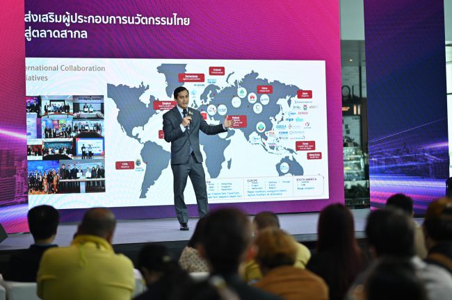 เพื่อยกระดับผู้ประกอบการนวัตกรรมไทยสู่ตลาดสากล ภายใต้แนวคิด ‘Local to Global’ โดยมี 3 เป้าหมายหลัก ได้แก่ 1. การสร้างความเข้มแข็งระบบนวัตกรรมระดับภูมิภาค โดยส่งเสริมการเข้าถึงโครงสร้างพื้นฐานนวัตกรรมทั้งด้านองค์ความรู้ทางด้านธุรกิจ เทคโนโลยี ทรัพย์สินทางปัญญา โรงงานต้นแบบ การเงิน การลงทุน และการตลาดภายในประเทศและต่างประเทศ ผ่านความร่วมมือกับอุทยานวิทยาศาสตร์ภูมิภาคและมหาวิทยาลัยต่าง ๆ การสร้างย่านนวัตกกรรม และเมืองนวัตกรรม 2. การพัฒนาอุตสาหกรรมเป้าหมายของประเทศไทย ด้วยการสนับสนุนด้านทรัพยากรและการเชื่อมโยงกับตลาด โดยมุ่งเน้นส่งเสริมอุตสาหกรรมที่มีความโดดเด่นและมีศักยภาพในการเติบโต ได้แก่ กลุ่มเกษตร อาหาร และสมุนไพร กลุ่มสุขภาพและการแพทย์ กลุ่มพลังงาน สิ่งแวดล้อม ยานยนต์ไฟฟ้า กลุ่มการท่องเที่ยว และกลุ่มซอร์ฟพาวเวอร์ ตลอดจนพัฒนากำลังคนเพื่อสนับสนุนอุตสาหกรรม ได้แก่ ปัญญาประดิษฐ์ (AI) ยานยนต์ไฟฟ้า (EV) และ เซมิคอนดักเตอร์ และ 3. การส่งเสริมผู้ประกอบการนวัตกรรมไทยสู่ตลาดสากล สร้างโอกาสการขยายธุรกิจ และโอกาสการระดมทุน เพื่อยกระดับขีดความสามารถทางนวัตกรรมและการแข่งขันของประเทศ ผ่านการเชื่อมตลาดระหว่างประเทศ การสร้างความร่วมมือกับพันธมิตร และกิจกรรมจับคู่ธุรกิจในต่างประเทศ เช่น สหรัฐอเมริกา ฟินแลนด์ จีน ญี่ปุ่น เกาหลี และฮ่องกง