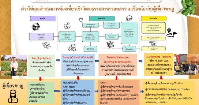 รูปแบบการจัดการท่องเที่ยวเชิงวัฒนธรรมอาหารตลอดห่วงโซ่นี้ จะเป็นโอกาสอันดีให้นักท่องเที่ยวได้เติมเต็มประสบการณ์ เก็บเกี่ยว วัฒนธรรมท้องถิ่น และสัมผัสกิจกรรมท่องเที่ยวอันหลากหลายที่เกี่ยวเนื่องมาจากอาหาร ซึ่งสอดแทรกประโยชน์ให้เกิดกับสังคมเศรษฐกิจของทุกภาคส่วนที่เกี่ยวข้องกับอุตสาหกรรมการท่องเที่ยวแต่ละภูมิภาค โดยมี 4 เสาหลักเป็นองค์ประกอบ คือ การผลิตอาหารและการเกษตร เรื่องเล่าอาหาร ผลิตภัณฑ์อาหารส่งเสริมการท่องเที่ยวเชิงสร้างสรรค์ และการพัฒนาอย่างยั่งยืน ซึ่งประเทศไทยมีความโดดเด่นและเอกลักษณ์ของอาหารไทยอันเกิดจากรากเหง้าของความเป็นเมืองพหุวัฒนธรรม ผสมผสานการใช้เครื่องเทศ วัตถุดิบ กรรมวิธีการผลิต การประยุกต์อาหารจากหลายชาติให้เข้ากับวัตถุดิบในท้องถิ่นไทย ผนวกกับการคิดค้นกรรมวิธีการปรุง ความประณีตในการจัดตกแต่งอาหาร งานแกะสลักที่เริ่มมีลักษณะเฉพาะในราชสกุลของกลุ่มชนชั้นสูงตามวังของขุนนางต่าง ๆ ในยุครัตนโกสินทร์ตอนต้นและตอนกลาง จึงทำให้อาหารไทยในปัจจุบันมีความหลากหลาย รสชาติกลมกล่อม และมีรูปร่างหน้าตาอาหารที่ดูน่ารับประทาน ที่สามารถนำไปสู่การสร้างความยั่งยืนทางเศรษฐกิจภาคธุรกิจอาหารและการท่องเที่ยว ตามนโยบายของรัฐบาลในการใช้ “วัฒนธรรมอาหารไทย” เป็นกลไกให้เกิด Soft Power  บนพื้นฐานของทุนมนุษย์ที่เข้มแข็งยอมเป็นส่วนสำคัญต่อการแข่งขันกับตลาดโลก