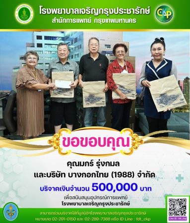 โรงพยาบาลเจริญกรุงประชารักษ์ รับมอบเงินบริจาค 500,000 บาท สนับสนุนอุปกรณ์การแพทย์