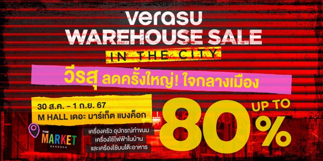 วีรสุผู้นำเข้าและจำหน่ายสินค้าเครื่องครัว เครื่องใช้ไฟฟ้าภายในบ้านและอุปกรณ์บนโต๊ะอาหาร แบรนด์ดังนำเข้าจากต่างประเทศ จัดรายการ VERASU WAREHOUSE SALE IN THE CITY ลดครั้งใหญ่ใจกลางเมือง ลดสูงสุด 80% พบกับสินค้าคุณภาพ อาทิ เครื่องครัว อุปกรณ์ทำขนม เครื่องใช้ไฟฟ้าในบ้าน และเครื่องใช้บนโต๊ะอาหาร มากมาย ที่ชั้น M ศูนย์การค้า เดอะ มาร์เก็ต แบงคอก ราชประสงค์ เวลา 11.00 – 20.00 น.วันที่ 30 ส.ค. – 1 ก.ย. 67