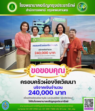 วันที่ 29 สิงหาคม 2567 โรงพยาบาลเจริญกรุงประชารักษ์ ขอขอบคุณ ครอบครัวผ่องจิตวัฒนา บริจาคเงินจำนวน 240,000 บาท เพื่ออุทิศแด่คุณพ่อชาญชัย และคุณแม่สุพัตรา ผ่องจิตวัฒนา ให้กับมูลนิธิโรงพยาบาลเจริญกรุงประชารักษ์ ในนามคณะผู้บริหารและบุคลากร โรงพยาบาลเจริญกรุงประชารักษ์ ขอกราบขอบคุณ พร้อมร่วมอนุโมทนาบุญในจิตศรัทธาของทุกท่าน ขออำนวยพรให้สิ่งศักดิ์สิทธิ์ ที่ท่านเคารพสักการะโปรดดลบันดาล ให้ท่านและครอบครัวมีสุขภาพกาย สุขภาพจิตแข็งแรง เจริญรุ่งเรืองในกิจการที่ประกอบ มา ณ ที่นี้