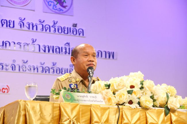 นางพรรณวิภา สังฆทิพย์ ผู้อำนวยการสำนักงานคณะกรรมการการเลือกตั้งประจำจังหวัดร้อยเอ็ด กล่าวว่า กิจกรรมการประชุมเชิงปฏิบัติการบูรณาการแผนการสร้างพลเมืองคุณภาพ ในวันนี้ สำนักงานคณะกรรมการการเลือกตั้งในฐานะหน่วยงานหลักในการสร้างความรู้ความเข้าใจที่ถูกต้องแก่ประชาชนเกี่ยวกับการปกครองระบอบประชาธิปไตยอันมีพระมหากษัตริย์ทรงเป็นประมุข ได้ดำเนินการบูรณาการความร่วมมือกับหน่วยงานภาคีเครือข่าย 6 หน่วยงาน อันประกอบไปด้วย สำนักงานคณะกรรมการการเลือกตั้ง กระทรวงมหาดไทย กระทรวงสาธารณสุข กระทรวงศึกษาธิการ กระทรวงการพัฒนาสังคมและความมั่นคงของมนุษย์ และกรมประชาสัมพันธ์ สำนักนายกรัฐมนตรี โดยมี เป้าหมายให้ ศส.ปชต. เป็นกลไกในการขับเคลื่อนกิจกรรม สามารถนำนโยบายสู่การปฏิบัติ อย่างเป็นรูปธรรม และมีประสิทธิภาพ ตามบันทึกความร่วมมือในระดับจังหวัดมีเวทีแลกเปลี่ยน เรียนรู้ประสบการณ์ในการจัดกิจกรรมสร้างเสริมวิถีประชาธิปไตย และพัฒนาแนวทางสู่