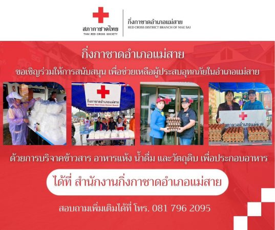 สอบถามรายละเอียดเพิ่มเติมได้ที่ กิ่งกาชาดอำเภอแม่สาย โทรศัพท์ 081 796 2095 กรณีที่ต้องการร่วมช่วยเหลือผู้ประสบ #อุทกภัย ท่านสามารถบริจาคกับ #สภากาชาดไทย ได้ที่ : https://www.donationhub.or.th/