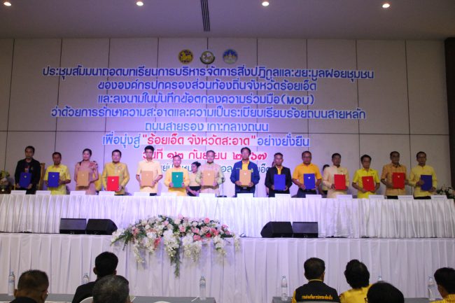 นอกจากนี้จังหวัดร้อยเอ็ดได้จัดทำบันทึกข้อตกลงความร่วมมือ (MOU) ว่าด้วยการรักษาความสะอาด และความเป็นระเบียบเรียบร้อยถนนสายหลัก ถนุนสายรอง เกาะกลางถนนเพื่อให้มีการดำเนินการร่วมกัน ระหว่างแขวงทางหลวงร้อยเอ็ด แขวงทางหลวงชนบทร้อยเอ็ด แขวงทางหลวงยโสธร และองค์กรปกศรองส่วนท้องถิ่นทุกแห่งในพื้นที่จังหวัดร้อยเอ็ด ในการรักษาความสะอาดและความเป็นระเบียบเรียบร้อยถนนสายหลัก ถนนสายรอง เกาะกลางถนน เพื่อมุ่งสู่ ” ร้อยเอ็ด จังหวัดสะอาด” อย่างยั่งยืน การจัดการประชุมสัมมนาถอดบทเรียน การบริหารจัดการสิ่งปฏิกูลและมูลฝอยชุมชน ขององค์กรปกครองส่วนท้องถิ่นจังหวัดร้อยเอ็ด และพิธีลงนามในบันทึกข้อตกลงความร่วมมือ (MOU) ว่าด้วยการรักษาความสะอาด และความเป็นระเบียบเรียบร้อย ถนุนสายหลักถนนสายรอง เกาะกลางถนน เพื่อมุ่งสู่ “ร้อยเอ็ด จังหวัดสะอาด อย่างยั่งยืน” และ ได้เชิญหัวหน้าส่วนราชการ นายอำเภอ ท้องถิ่นอำเภอ ผู้บริหารองค์กรปกครองส่วนท้องถิ่นทุกแห่งในพื้นที่ทุกแห่ง ภาคีเครือข่าย และสื่อมวลชนทุกแขนงเข้าร่วมเป็นสักขีพยาน