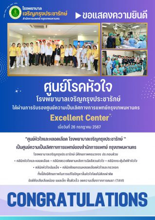 โรงพยาบาลเจริญกรุงประชารักษ์ ขอแสดงความยินดี ศูนย์โรคหัวใจ โรงพยาบาลเจริญกรุงประชารักษ์ได้ผ่านการรับรองศูนย์ความเป็นเลิศทางการแพทย์กรุงเทพมหานคร Excellent Center เมื่อวันที่ 26 กรกฎาคม 2567