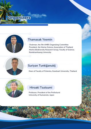 รศ.ดร.ธรรมศักดิ์ ยีมิน ประธานการจัดประชุมวิชาการนานาชาติชีววิทยาทางทะเลแห่งเอเชีย (5thAMBS) / ผศ.ดร.สุริยัน ธัญกิจจานุกิจ คณบดีคณะประมง มหาวิทยาลัยเกษตรศาสตร์ และ Professor Dr. Hiroaki Tsutsumi, President of the Prefectural University of Kumamoto, Japan ร่วมกันจัดประชุมวิชาการนานาชาติชีววิทยาทางทะเลแห่งเอเชีย (5thAMBS) ในระหว่างวันที่ 28-30 ตุลาคม 2567 ณ โรงแรม ดิเอมเมอรัลด์ รัชดาภิเษก กรุงเทพฯ โดยเป็นความร่วมมือของสมาคมวิทยาศาสตร์ทางทะเลแห่งประเทศไทย / ภาควิชาวิทยาศาสตร์ทางทะเล คณะประมง มหาวิทยาลัยเกษตรศาสตร์ / กลุ่มวิจัยความหลากหลายทางชีวภาพในทะเล ภาควิชาชีววิทยา คณะวิทยาศาสตร์ มหาวิทยาลัยรามคำแหง / The Japanese Association of Benthology / The Plankton Society of Japan