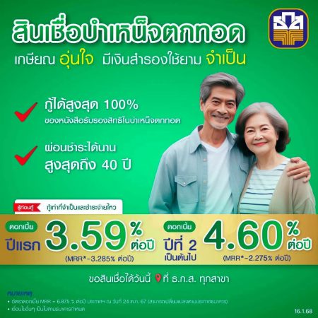 ธ.ก.ส. เสิร์ฟสินเชื่อบำเหน็จตกทอด เพื่อผู้เกษียณอายุ ดอกเบี้ยปีแรกเพียง 3.59%