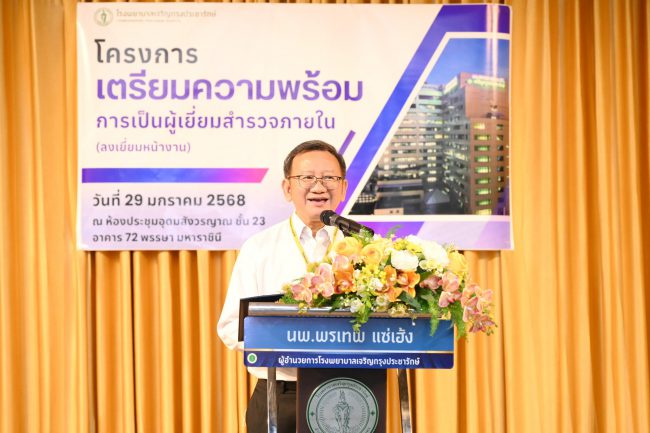 นพ.พรเทพ แซ่เฮ้ง ผู้อำนวยการโรงพยาบาลเจริญกรุงประชารักษ์ เป็นประธานเปิดโครงการเตรียมความพร้อมการเป็นผู้เยี่ยมสำรวจภายใน (ลงเยี่ยมหน้างาน) โครงการนี้มีเป้าหมายสำคัญ ในการผลักดันให้ทุกหน่วยงาน ทั้งทางคลินิกและหน่วยสนับสนุนบริการต่างๆ สามารถพัฒนากระบวนการคุณภาพและยกระดับงานบริการให้มีความเป็นเลิศซึ่งเป็นไปตามวิสัยทัศน์จองโรงพยาบาลเจริญกรุงประชารักษ์ คือ “โรงพยาบาลที่เป็นเลิศ เพื่อสุขภาพที่ดียิ่งขึ้น Do the best, Make the better health” เพราะเราชื่อว่า “คุณภาพและความปลอดภัยคือหัวใจของ รพจ. ในการอบรมครั้งนี้เพื่อให้ผู้เข้าร่วมสามารถนำความรู้และประสบการณ์ที่ได้ไปประยุกต์ใช้จริงในหน้างาน ณ ห้องประชุมอุดมสังวรญาณ ชั้น 23 อาคาร 72 พรรษา มหาราชินี