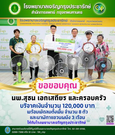 นพ.พรพเทพ แซ่เฮ้ง ผู้อำนวยการโรงพยาบาลเจริญกรุงประชารักษ์ และคณะผู้บริหารโรงพยาบาลฯ ขอขอบคุณ นพ.สุธน เอกเสถียร และครอบครัว บริจาคเงินจำนวน 120,000 บาท พร้อมพัดลมตั้งพื้น จำนวน 8 ตัวและนาฬิกาแขวนผนัง จำนวน 3 เรือน ให้กับมูลนิธิโรงพยาบาลเจริญกรุงประชารักษ์