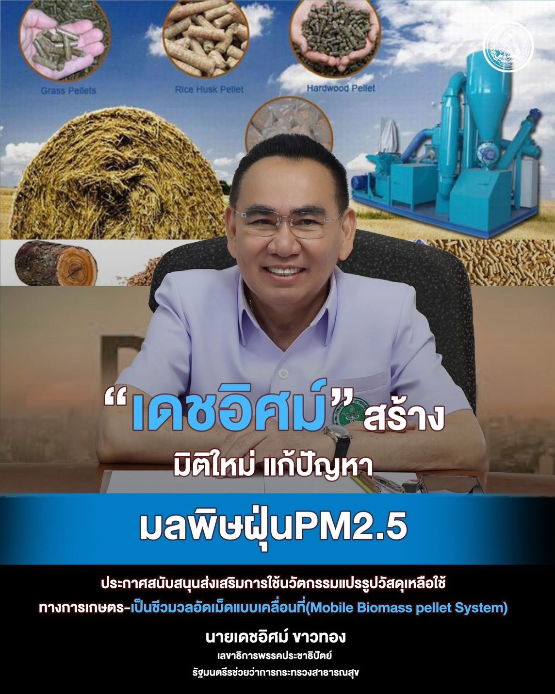 นายเดชอิศม์ ขาวทอง เลขาธิการพรรคประชาธิปัตย์ และรัฐมนตรีช่วยว่าการสาธารณสุข ได้สร้างมิติใหม่ในการแก้ไขปัญหามลพิษฝุ่น PM 2.5ให้กับประเทศ โดยประกาศสนับสนุนส่งเสริมการใช้นวัตกรรมระบบแปรรูปเศษวัสดุเหลือใช้ทางการเกษตรเป็นชีวมวลอัดเม็ดแบบเคลื่อนที่ (Mobile biomass pellet system) ซึ่งเป็นนวัตกรรมสีเขียวที่ถูกคิดค้นวิจัยและพัฒนาภายใต้บันทึกข้อตกลงความร่วมมือระหว่างกรมควบคุมมลพิษกับภาคเอกชน ที่มีขีดความสามารถในการนำเศษวัสดุเหลือใช้ทางการเกษตร ตอซังฟางข้าว , ต้นเปลือกซังข้าวโพด และใบอ้อยในพื้นที่การเพาะปลูกทั่วประเทศมาแปรรูปเป็นชีวมวลอัดเม็ดซึ่งเป็นเชื้อเพลิงเผาไหม้สะอาดที่มีความเป็นกลางทางคาร์บอน(carbon neutral)เพื่อนำไปใช้เป็นพลังงานทดแทนการใช้พลังงานจากเชื้อเพลิงฟอสซิลในการผลิตพลังงานไฟฟ้าสะอาดและการผลิตของภาคอุตสาหกรรม ซึ่งจะทำให้ต่อไปเกษตรกรทั่วประเทศไม่ต้องเผาเศษวัสดุเหลือใช้ทางการเกษตร ทำให้สามารถป้องกันไม่ให้เกิดมลพิษฝุ่น PM 2.5 จากการเผาเศษวัสดุเหลือใช้ทางการเกษตรในพื้นที่เพาะปลูกได้100% และเกษตรกรยังจะได้รับรายได้จากค่าเศษวัสดุเหลือใช้ทางการเกษตรได้อีก นอกจากนี้ยังจะมีการส่งเสริม ให้เกษตรกรนำพื้นที่เพาะปลูกบางส่วนมาเพราะปลูกไผ่เพื่อใช้นวัตกรรมดังกล่าวแปรรูปไผ่เป็นชีวมวลอัดเม็ดเพื่อส่งออกไปยังต่างประเทศเพื่อนำเงินตราเข้าประเทศเพื่อสร้างรายได้เพิ่มขึ้นให้กับประเทศและเพื่อทำให้เกษตรกรมีรายได้จากไผ่มากกว่ารายได้จากการเพาะปลูกพืชผลเดิมรวมถึง เพื่อเป็นการเพิ่มพื้นที่ป่าป้องกันอุทกภัยและน้ำป่าไหลหลากในพื้นที่ลาดสูงชันในภาคเหนือ