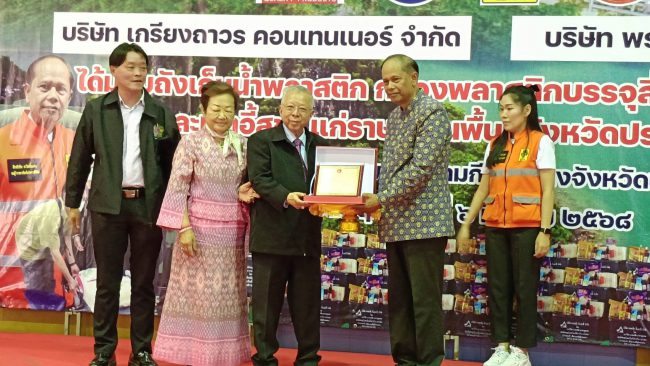 จากนั้น ผวจ.ประจวบฯ ได้มอบของที่ระลึก โล่ประกาศเกียรติคุณ หนังสือแสดงความขอบคุณให้กับคณะผู้บริจาค ก่อนร่วมกันทำพิธีปล่อยขบวนรถบรรทุกถังน้ำเคลื่อนออกจากสนามกีฬากลางจังหวัดฯ ไปมอบให้แก่ครัวเรือนในพื้นที่ประสบปัญหาภัยแล้งซ้ำซากใน อ.ทับสะแก 41 ใบ อ.เมืองประจวบฯ 57 ใบ และ อ.สามร้อยยอด 2 ใบ เพื่อให้มีภาชนะสำหรับใช้ในการเก็บกักน้ำเพื่อการอุปโภคบริโภค บรรเทาความเดือดร้อนจากการขาดแคลนน้ำในช่วงหน้าแล้ง ส่วนสิ่งของอุปโภคบริโภคจะนำไปมอบให้แก่ประชาชนผู้ยากไร้ ตามที่ได้มีการสำรวจข้อมูลความต้องการในพื้นที่ทั้ง 8 อำเภอ แบ่งเป็น อ.เมืองประจวบฯ 50 ชุด อ.ทับสะแก 40 ชุด ส่วนอีก 6 อำเภอ ได้แก่ อ.หัวหิน อ.ปราณบุรี อ.สามร้อยยอด อ.กุยบุรี อ.บางสะพาน อ.บางสะพานน้อย ได้รับมอบอำเภอละ 10 ชุด ขณะที่เก้าอี้สุขาจะนำไปมอบให้แก่ผู้สูงอายุ ผู้ป่วยติดเตียงในพื้นที่ อ.หัวหิน 3 ตัว อ.ปราณบุรี 22 ตัว อ.สามร้อยยอด 1 ตัว อ.กุยบุรี 63 ตัว อ.เมืองประจวบฯ 27 ตัว อ.ทับสะแก 26 ตัว อ.บางสะพาน 48 ตัว และ อ.บางสะพานน้อย 10 ตัว