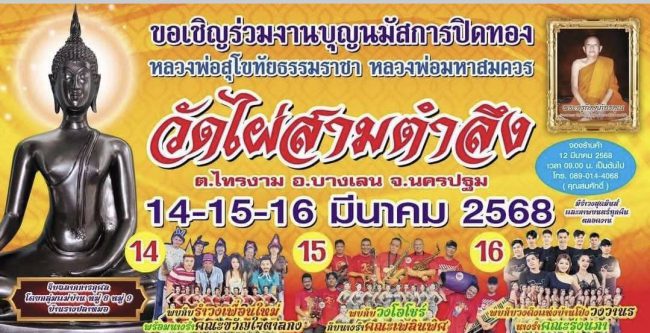 โดยงานประจำปีในปีนี้ ภายในงาน จัดให้มีมหรสพ การเชิดสิงโตและมังกรทอง ชมดนตรีรำวงย้อนยุคจากคณะดัง และออกร้านขายอาหาร 3 วัน 3 คืน จึงขอเชิญชวนพุทธศาสนิกชนที่ศรัทธาในพระพุทธศาสนาร่วมทำบุญปิดทอง “หลวงพ่อสุโขทัยธรรมราชา” ประจำปี 2568 ณ วัดไผ่สามตำลึง ตำบลไทรงาม อำเภอบางเลน จังหวัดนครปฐม ระหว่างวันที่ 14 ถึง 16 มีนาคม 2568 (พระครูปลัดวิทยา ฐานะธัมโม เจ้าอาวาส