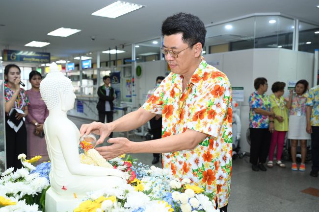 นพ.พรเทพ แซ่เฮ้ง ผู้อำนวยการโรงพยาบาลเจริญกรุงประชารักษ์ พร้อมคณะผู้บริหาร และบุคลากรของโรงพยาบาลฯ ร่วมสรงน้ำพระพุทธรูป เพื่อเสริมความเป็นสิริมงคล และการอนุรักษ์วัฒนธรรมไทย เนื่องในวันเทศกาลสงกรานต์ พ.ศ. 2568 ณ โถงกลางชั้น 1 อาคาร 72 พรรษา มหาราชินี โรงพยาบาลเจริญกรุงประชารักษ์