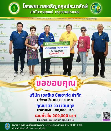 นพ.พรเทพ แซ่เฮ้ง ผู้อำนวยการโรงพยาบาลเจริญกรุงประชารักษ์ ขอขอบคุณ บริษัท เอสอีเอ ชิพยาร์ด จำกัด บริจาคเงิน 100,000 บาท และคุณชาตรี จิวรวัฒนกุล บริจาคเงิน 100,000 บาท รวมทั้งสิ้น 200,000 บาท ให้กับมูลนิธิโรงพยาบาลเจริญกรุงประชารักษ์