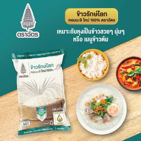 ข้าวตราฉัตร “ข้าวรักษ์โลก” คือข้าวหอมมะลิใหม่ที่ปลูกในวิธีที่ลดการปล่อยก๊าซเรือนกระจก CO2ได้ถึง 50% เมื่อเทียบกับการปลูกข้าวทั่วไปโดยให้ความสำคัญกับการช่วยลดโลกร้อนอย่างแท้จริง สามารถตรวจสอบย้อนกลับถึงสายพันธุ์ทุกเมล็ดข้าว เพื่อให้ผู้บริโภคมั่นใจในคุณภาพและความปลอดภัย นอกจากนี้ข้าวตราฉัตรยังใส่ใจเกษตรกรไทย ด้วยการส่งเสริมการเกษตรที่ยั่งยืนพร้อมช่วยเพิ่มรายได้และสร้างความมั่นคงทางเศรษฐกิจให้กับชุมชน นับเป็นส่วนสำคัญในการสร้างโลกที่ดีขึ้น