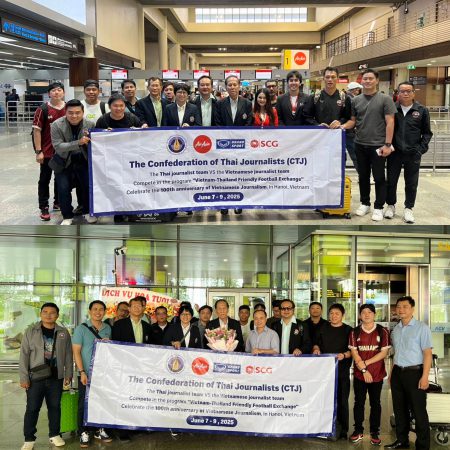 เมื่อวันที่ 7 มิถุนายน 2568 เวลา 10.05 น. นายนคร วีระประวัติ ประธานสมาพันธ์สื่อมวลชนแห่งประเทศไทย พร้อมด้วย น.ส.นรินี เรืองหนู รองประธานสมาพันธ์ฯ, นายดำฤทธิ์ วิริยะกุล เลขาธิการ และนายอนุชา เจริญโพธิ์ รองเลขาธิการ ได้นำทีมฟุตซอลนักข่าวไทยเดินทางไปแข่งขันกระชับมิตรกับทีมนักข่าวเวียดนาม ในโอกาสเฉลิมฉลอง 100 ปี สื่อมวลชนเวียดนาม ที่กรุงฮานอย ประเทศเวียดนาม ระหว่างวันที่ 7-9 มิถุนายน 2568