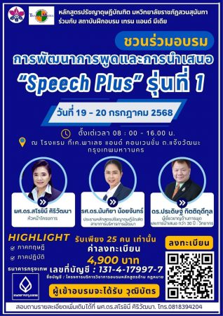 หลักสูตรปรัชญาฤษฎีบัณฑิต มหาวิทยาลัยราชภัฏสวนสุนันทา ร่วมกับ สถาบันอบรม เทรน แอนด์ มีเดีย จัดอบรมหลักสูตร Speech Plus “การพัฒนาการพูดและการนำเสนอ” รุ่นที่ 1