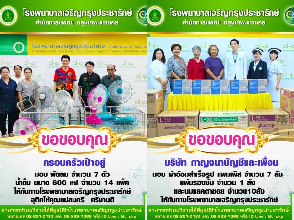 โรงพยาบาลเจริญกรุงประชารักษ์ขอขอบคุณในน้ำใจอันงดงามของทุกท่าน ที่ร่วมแบ่งปันเพื่อคุณภาพชีวิตที่ดีของผู้ป่วยอย่างแท้จริง