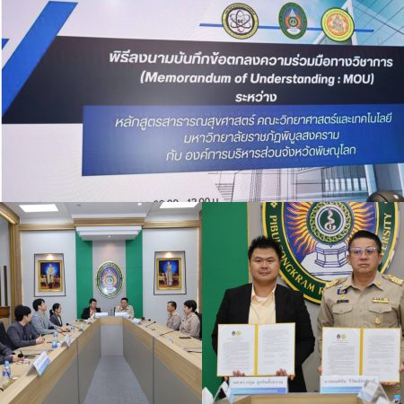 วันที่ 30 มิถุนายน 2568 นายมนต์ชัย วิวัฒน์ธนาฒย์ นายกองค์การบริหารส่วนจังหวัดพิษณุโลก และ ผศ.ดร.กฤษ สุจริตตั้งธรรม คณะบดีคณะวิทยาศาสตร์และเทคโนโลยี มหาวิทยาลัยราชภัฏพิบูลสงคราม ร่วมลงนามในบันทึกข้อตกลงความร่วมมือทางวิชาการ ในการพัฒนาศักยภาพนักศึกษาสู่การเป็นบุคลากรในสายงานสาธารณสุข มีหัวหน้าส่วนราชการองค์การบริหารส่วนจังหวัดพิษณุโลก ร่วมเป็นเกียรติในพิธี ณ อาคารทีปวิชญ์ มหาวิทยาลัยราชภัฏพิบูลสงคราม