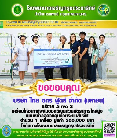 เมื่อวันที่ 4 กรกฎาคม 2568 นพ.พรเทพ แซ่เฮ้ง ผู้อำนวยการโรงพยาบาลเจริญกรุงประชารักษ์ พร้อมด้วยคณะผู้บริหาร ขอขอบคุณ บริษัท ไทย อกริ ฟู้ดส์ จำกัด (มหาชน) ที่ได้บริจาค เครื่อง Airvo 3 สำหรับให้อากาศผสมออกซิเจนด้วยอัตราการไหลสูงแบบหน้าจอควบคุมระบบสัมผัส จำนวน 1 เครื่อง มูลค่า 300,000 บาท ให้แก่โรงพยาบาลเจริญกรุงประชารักษ์