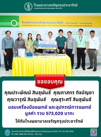 นพ.พรเทพ แซ่เฮ้ง ผู้อำนวยการโรงพยาบาลเจริญกรุงประชารักษ์ พร้อมด้วยคณะผู้บริหารโรงพยาบาล ขอแสดงความขอบคุณอย่างยิ่งต่อ คุณประพัฒน์ สินธุพันธ์, คุณภาสกร กิจบัญชา, คุณวารุณี สินธุพันธ์ และคุณสุระศรี สินธุพันธ์ ในโอกาสมอบเครื่องมือแพทย์และอุปกรณ์ทางการแพทย์ มูลค่ารวมทั้งสิ้น 573,020 บาท ให้แก่โรงพยาบาลเจริญกรุงประชารักษ์ เพื่อสนับสนุนการดูแลรักษาผู้ป่วยและยกระดับคุณภาพบริการทางการแพทย์