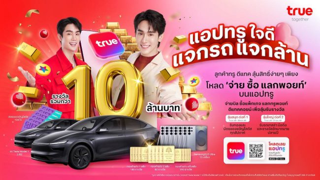 แคมเปญ “แอปทรูใจดี แจกรถ แจกล้าน” เปลี่ยนทุกการใช้งานแอปทรู ให้กลายเป็นโอกาสลุ้นรางวัลใหญ่ตลอดครึ่งปีหลังนี้ ตั้งแต่ 1 กรกฎาคม – 31 ธันวาคม 2568 รวมมูลค่าของรางวัลกว่า 10 ล้านบาท พร้อมแจกจริงทุกสัปดาห์ และมีลุ้นรางวัลใหญ่ส่งท้ายปีคือ รถยนต์ Tesla จำนวน 2 คัน