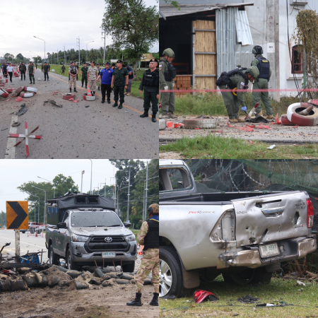 เมื่อเวลา 07.00 น. วันที่ 21 ส.ค.68 พล.ท.ไพศาล หนูสังข์ แม่ทัพภาคที่ 4 / ผู้อำนวยการรักษาความมั่นคงภายในภาค 4 ได้เดินทางไปยัง ชคต.ศาลาใหม่ ม.1 ต.ศาลาใหม่ อ.ตากใบ จ.นราธิวาส เพื่อติดตามสถานการณ์และความคืบหน้า เหตุคนร้ายลอบวางระเบิดคาร์บอมบ์ เหตุเกิดในช่วงคืนที่ผ่านมา ทำให้เจ้าหน้าที่ อส.ประจำฐานปฏิบัติการชุดคุ้มครองตำบลได้รับบาดเจ็บหลายราย โดยมี พ.ต.อ.ประยงค์ โคตรสาขา รอง ผบก.ภ.จว.นราธิวาส พ.ต.อ.อัสรี ต่วนเพ็ง ผกก.สภ.ตากใบ นายกฤษฎา สุขสบาย นายอำเภอตากใบ น.อ.สันติ เกศศรีพงษ์ศา ผู้บัญชาการกรมทหารราบที่ 3 กองพลนาวิกโยธิน คอยให้การต้อนรับ และนำเรียนข้อมูลต่างๆเกี่ยวกับเหตุการณ์ที่เกิดขึ้น ซึ่ง พล.ท.ไพศาล แม่ทัพภาคที่ 4 ได้เดินดูจุดเกิดเหตุที่สร้างความเสียหายต่อฐานปฏิบัติการซึ่งเป็นช่วงบริเวณหัวมุมด้านซ้ายมือ ซึ่งมีรถยนต์กระบะส่วนตัวของเจ้าหน้าที่ อส.ยี่ห้อโตโยต้า สีบรอนส์ ทะเบียน บฉ 8597 นราธิวาส ได้รับความเสียหาย 1 คัน ซึ่งถูกสะเก็ดระเบิดที่บริเวณฝาท้ายขอกระบะ และบริเวณหน้าฐานบางส่วน ซึ่งได้รับความเสียหายจากอนุภาพระเบิด เป็นรถยนต์หุ้มเกราะยี่ห้อโตโยต้า สีบรอนส์ ทะเบียน 3 ตซ 4792 กทม. พร้อมทั้งเรือนนอนที่ปลูกสร้างด้วยปูนที่หลังคากระเบื้องแตกเสียหายจำนวนหนึ่ง รวมทั้งรถ จยย.ของ อส.ที่จอดอยู่ภายในฐานได้รับความเสียหายจำนวนหลายคัน