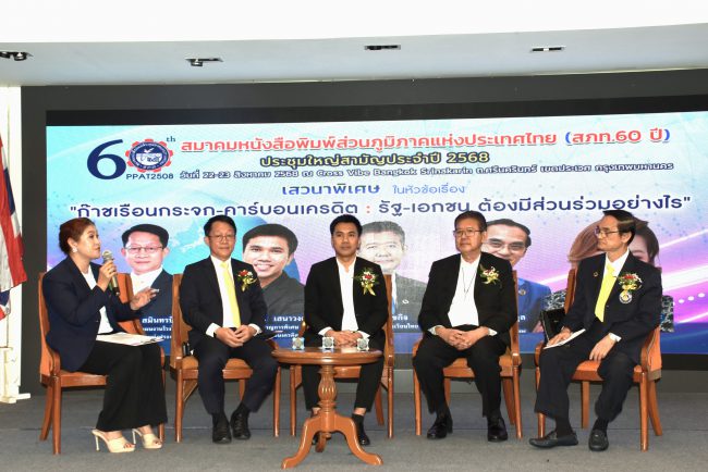 เมื่อวันเสาร์ที่ 23 สิงหาคม พ.ศ. 2568 สมาคมหนังสือพิมพ์ส่วนภูมิภาคแห่งประเทศไทย (สภท.60ปี) จัดการประชุมใหญ่สามัญประจำปี 2568 (รับรองงบดุล 2567) โดยในเวลา 10.00 น. ได้จัดให้มีการเสวนาพิเศษ เรื่อง : “ก๊าซเรือนกระจก-คาร์บอนเครดิต : รัฐ-เอกชน ต้องมีส่วนร่วมอย่างไร” โดยได้รับเกียรติจากวิทยากรที่มีองค์ความรู้ อาทิ : นายเอกรัตน์ สมินทรปัญญา ผู้ช่วยผู้ว่าการแผนกงานโรงไฟฟ้า การไฟฟ้าฝ่ายผลิตแห่งประเทศไทย (กฟผ.), นายอภิสิทธิ์ เสนาวงศ์ นักวิชาการชำนาญการพิเศษ สำนักรับรองคาร์บอนเครดิต (องค์การบริหารจัดการก๊าซเรือนกระจก “องค์การมหาชน”), นายอาทิตย์ เวชกิจ นายกสมาคมพลังงานหมุนเวียนไทย (RE100), ดร.สุวัฒน์ ทองธนากุล บรรณาธิการ Green & SD Manager Online (สื่อในเครือผู้จัดการ) ให้เกียรติมาร่วมวงเสวนา โดยมี น.ส.สุพัตรา สมถวนิช รองเลขาธิการสมาคมฯ เป็นพิธีกรดำเนินรายการ ณ Cross Vibe Bangkok Srinakarin (โรงแรมคิงปาร์ค อเวนิว) ถ.ศรีนครินทร์ ซ. 40 เขตประเวศ กรุงเทพฯ