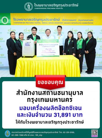 โรงพยาบาลเจริญกรุงประชารักษ์ รับมอบเงินบริจาคและเครื่องผลิตออกซิเจน จากสำนักงานสถานธนานุบาลกรุงเทพมหานคร