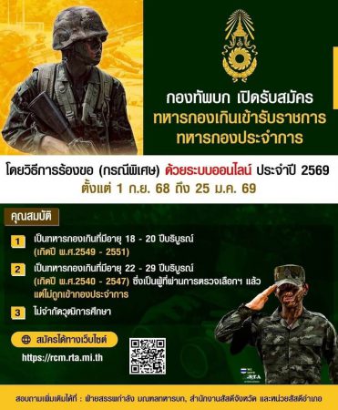 “การรับสมัครทหารกองเกินเข้ารับราชการทหารกองประจำการ โดยวิธีร้องขอ (กรณีพิเศษ) ด้วยระบบออนไลน์ ประจำปี 2569”