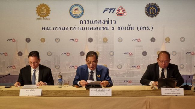 วันที่ 1 ตุลาคม 2568 ดร.พจน์ อร่ามวัฒนานนท์ ประธานสภาหอการค้าแห่งประเทศไทย เป็นประธานการประชุมคณะกรรมการร่วมภาคเอกชน 3 สถาบัน (กกร.) โดยมี นายเกรียงไกร เธียรนุกุล ประธานสภาอุตสาหกรรมแห่งประเทศไทย และนายผยง ศรีวณิช ประธานสมาคมธนาคารไทย ร่วมแถลงข่าว