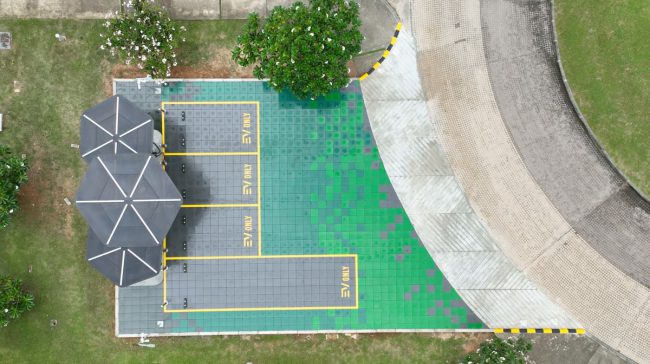 นอกจากหลังคาโพลีคาร์บอเนตรีไซเคิลจากโคเวสโตรแล้ว สถานีชาร์จแห่งนี้ยังใช้พื้นคอนกรีต EGAT AshNova ที่ผลิตจากเถ้าลอย (Fly Ash) ซึ่งเป็นวัตถุพลอยได้จากกระบวนการผลิตไฟฟ้าของโรงไฟฟ้าแม่เมาะ จ.ลำปาง ช่วยลดการใช้ซีเมนต์และลดการปล่อยก๊าซคาร์บอนไดออกไซด์จากกระบวนการผลิตซีเมนต์ได้สูงถึง 58% รวมถึงการใช้สีโพลียูรีเทนที่มีค่า VOC ต่ำจากบริษัท นิป -ปอนเพนต์ (ประเทศไทย) จำกัด
