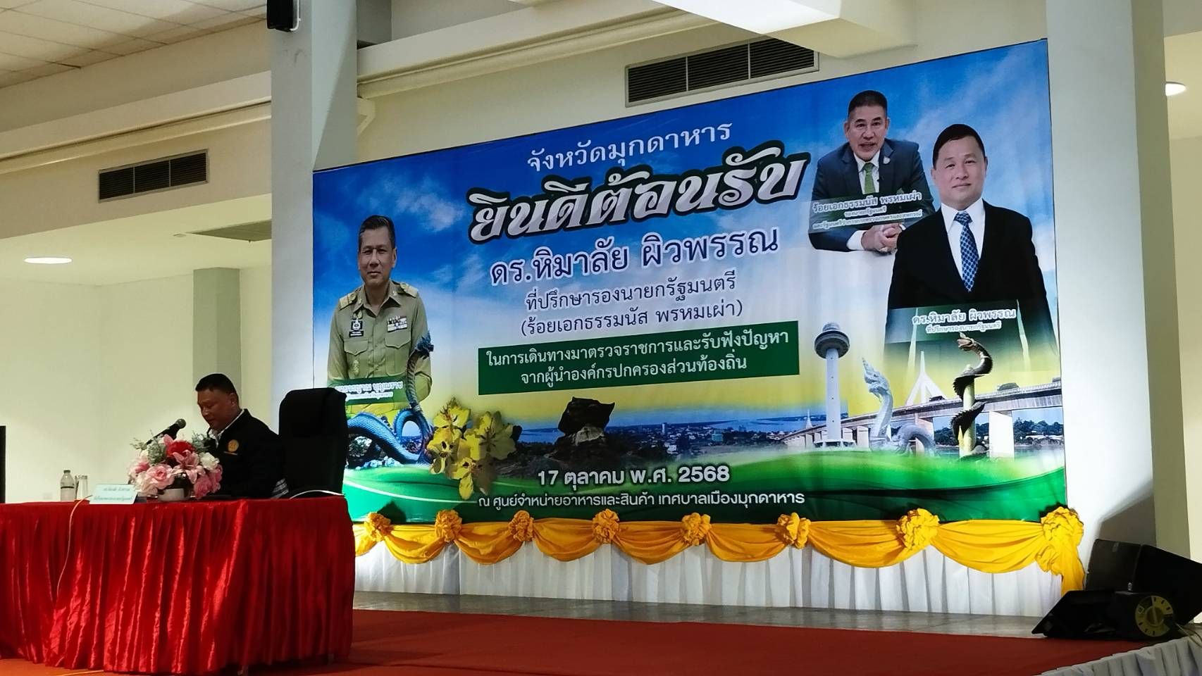 เมื่อวันที่ 17 ตุลาคม 2568 ดร.หิมาลัย ผิวพรรณ ที่ปรึกษาของรองนายกรัฐมนตรีและรัฐมนตรีว่าการกระทรวงเกษตรและสหกรณ์ (ร้อยเอกธรรมนัส พรหมเผ่า) และคณะติดราชการสำคัญ โดยมี นายไกร เอี่ยมจุฬา รองผู้ว่าราชการจังหวัดมุกดาหาร ได้รับมอบหมายจากผู้ว่าราชการจังหวัดมุกดาหาร นายกเทศมนตรีทุกเทศบาลในจังหวัดมุกดาหาร หัวหน้าส่วนราชการ พี่น้องประชาชนชาวจังหวัดมุกดาหาร ให้การต้อนรับ ในโอกาสเดินทางมาตรวจราชการและรับฟังปัญหาจากผู้นำองค์กรปกครองส่วนท้องถิ่น ณ ศูนย์จำหน่ายอาหารและสินค้า เทศบาลเมืองมุกดาหาร จังหวัดมุกดาหาร