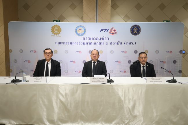 วันที่ 3 ธันวาคม 2568 นายเกรียงไกร เธียรนุกุล ประธานสภาอุตสาหกรรมแห่งประเทศไทย เป็นประธานการประชุมคณะกรรมการร่วมภาคเอกชน 3 สถาบัน (กกร.) นาย กอบศักดิ์ ดวงดี เลขาธิการสมาคมธนาคารไทยและ นาย ธวัชชัย เศรษฐจินดา กรรมการเลขาธิการ สภาหอการค้าแห่งประเทศไทย ร่วมแถลงข่าว โดยที่ประชุมกล่าวถึง