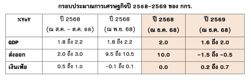- อุทกภัยในภาคใต้ ส่งผลต่อชีวิตและทรัพย์สินของครัวเรือนและธุรกิจอย่างมาก บางพื้นที่เป็นสาธารณภัยร้ายแรงอย่างยิ่ง (ระดับ 4) เทียบเคียงกับเหตุการณ์สึนามิในปี 2547 สร้างความเสียหายนับแสนล้านบาทที่จำเป็นต้องซ่อมแซมฟื้นฟู และยังส่งผลกระทบต่อรายได้ โดยในช่วงเดือน ธ.ค. 2568 สูญเสียรายได้ราว 2-3 หมื่นล้านบาท หรือ 0.1% ถึง 0.2% ของ GDP ส่งผลให้เศรษฐกิจไทยทั้งปีขยายตัวได้เพียง 2.0% สำหรับในปี 2569 ประเมินผลกระทบต่อรายได้ราว 9 หมื่นล้านบาท